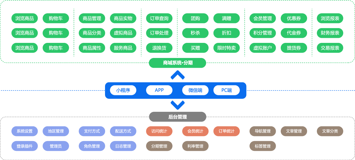 商城系统可以轻松支持多个客户端,例如PC、手机浏览器、微信、APP、平板等,不放过任何一个终端客户,为您全面打通所有用户设备。